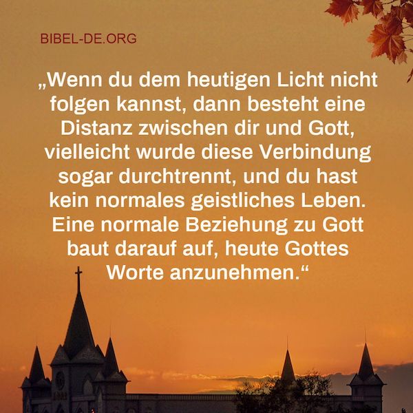 „Wenn du dem heutigen Licht nicht folgen kannst, dann besteht eine Distanz zwischen dir und Gott, vielleicht wurde diese Verbindung sogar durchtrennt, und du hast kein normales geistliches Leben. Eine normale Beziehung zu Gott baut darauf auf, heute Gottes Worte anzunehmen.“